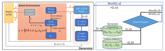 Fortunately, the proposal of GAIL solves the problem of time-consuming training in many tasks [21]. GAIL learns the optimal policy directly from expert data by combining Inverse RL (IRL) [22] with Generative Adversarial Networks (GANs) [23]. In [24], a GAIL-based DRL method is introduced to train an Autonomous Underwater Vehicle (AUV) to emulate expert paths. Similarly, in [25], a GAIL-driven navigation system for Unmanned Surface Vehicles (USVs) is proposed, which learns a policy to mimic expert trajectories. The above-mentioned references [24,25] use the on-policy algorithms PPO and Trust Region policy optimization (TRPO) [26] as generators, respectively [27]. Although the on-policy algorithm is stable, it is challenging to learn a superior control policy due to the expense of sample efficiency GAIL policy training. When the robot environment model is unknown, the exploration ability of the algorithm is crucial. Meanwhile, off-policy methods exhibit superior sample efficiency, but their training process is unstable [28]. Fortunately, by utilizing the LSTM network, the evolving patterns of joint positions over time are competently captured and comprehended, thereby mitigating instability during the training process of robotic manipulators for tracking control tasks. Therefore, the main focus of this paper is to embed LSTM into the SAC algorithm and utilize the resulting SAC-LSTM algorithm as a generator for GAIL training. This approach aims to address the trajectory tracking control problem for the end effector of manipulator systems under input saturation and random interference. The principal contributions are summarized as follows: