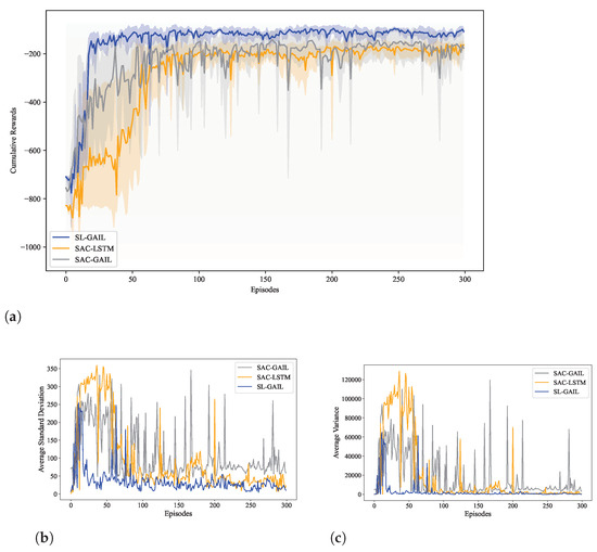 The trends in cumulative reward values obtained by the three algorithms, and the standard deviation and variance of the cumulative reward are shown in Figure 5. The results show that the cumulative rewards value of the SL-GAIL agent tend to converge around the 20th episode and the learning curve is smooth later. However, the SAC-LSTM agent and the SAC-GAIL agent do not converge until after the 100th. At the same time, the variance and standard deviation of SL-GAIL are in a stable state after the 100th episode, but the variance and standard deviation of SAC-LSTM and SAC-GAIL always fluctuate greatly.