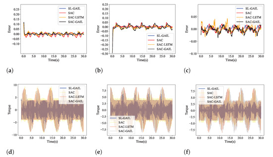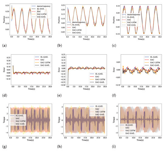 The tracking control performance of SL-GAIL is compared with SAC, SAC-LSTM, and SAC-GAIL. Figure 6 shows the tracking trajectories, tracking error, and a change in the torque of the end effector using SAC, SAC-GAIL, SAC-LSTM, and SL-GAIL during the training process in the control task. As demonstrated in Figure 6a–c, the trajectories of SAC, SAC-GAIL, SAC-LSTM, and SL-GAIL agents in the X-, Y-, and Z-axes are shown. The tracking errors of the end effector in the three axes are shown in Figure 6d–f. It can be seen that the SL-GAIL algorithm achieves more superior tracking control performance than the baseline methods. Figure 6g–i show the change trend of the torque for the joint; it can be seen that the torque of the robotic manipulator when controlled by SL-GAIL is smaller than that of SAC, SAC-GAIL, and SAC-LSTM.