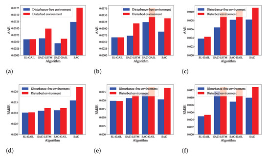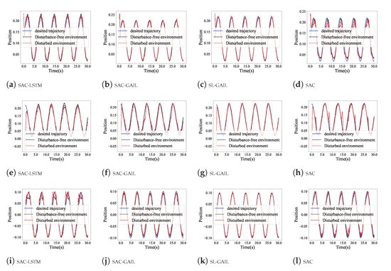 In order to evaluate the anti-interfere of SL-GAIL, we saved the optimal control policies trained with SAC-LSTM, SAC-GAIL, and SL-GAIL in the curve-following task. The control policies of the three agents are compared with the SL-GAIL algorithm. Figure 7 shows the position tracking of the four algorithms in a disturbance-free environment (DFENV) and a disturbed environment (DENV). The first, second, and third rows are the X, Y, and Z positions of the four algorithms, respectively. It is noted that, compared with the other three algorithms, the position tracking of the SL-GAIL algorithm changes very little in the two environments. The tracking error and torque changes of the four algorithms in the DENV are shown in Figure 8. It can be seen that the torques using SL-GAIL are still smaller than using SAC, SAC-LSTM, and SAC-GAIL. Figure 9 present the AAE and RMSE for all algorithms in the DFENV and DENV. The AAE and RMSE of SL-GAIL tested in the two environments have almost no change. However, the AEE and RMSE of the SAC, SAC-LSTM, and SAC-GAIL change significantly in the two environments. The changes in AAE under the two environments are shown in Table 3. The changes in RMSE under the two environments are shown in Table 4.