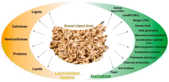 Brewers’ Spent Grain (BSG) is a by-product of the brewing process that has the potential for valorization in various industries, including construction []. Most BSGs end up in animal feed, in landfills, and as biogas, with lesser volumes being used for polymers, soil fertilizer, and paper, as shown in Figure 1. These applications are possible thanks to the fractions that can be found in BSGs, such as lignin, cellulose, hemicellulose, proteins, and lipids []. In the EU alone, there is an estimated 10.02 million tons of BSGs generated each year (2020) []. The current fetch price of this waste is EUR 40 a wet ton, and it can reach, for example, a market price of around EUR 180 a ton after being processed for bio-refinery applications []. However, storage conditions are important due to the microbiological activity of BSGs, as it can lead to fungal development []. This can be detrimental for the final application of this product and should be taken into consideration.