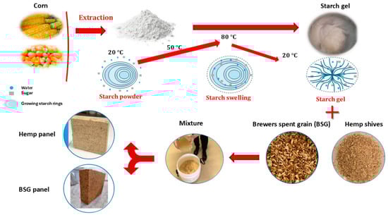 Overview of the manufacturing process for biocomposite building materials using Brewers’ Spent Grains and hemp shives, with gelatinized starch as a binder.