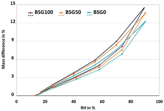 The sorption isotherms for all formulations exhibited a Type II isotherm, characteristic of porous materials, and this finding is consistent with findings in the literature on bio-based materials such as hemp and recycled agricultural waste [,]. Notably, BSG100, despite its lower porosity and higher density, displayed a significant capacity for moisture absorption, which can be attributed to the hydrophilic nature of BSGs. This aligns with previous studies that reported high moisture affinity in materials with similar organic compositions []. The porosity of hemp shives in BSG0 contributed to higher mass differentials during moisture absorption, yet the ability to retain moisture was lower than that of BSG100. This trend of lower moisture retention with higher porosity has been documented in materials like hemp composites [].