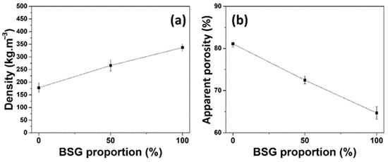 (a) Density of specimens with different proportions of BSG and (b) apparent porosity of panels with different proportions of BSG.