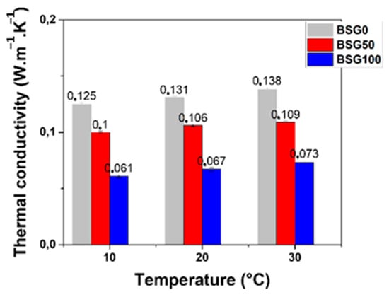 As shown in Figure 6, the thermal conductivity of the panels formulated solely with BSGs was measured to be 0.131 W/(m·K) at 20 °C, which is significantly higher than that of the formulation containing only hemp shives, as the latter exhibits a thermal conductivity of 0.067 W/(m·K). The mixed formulation (BSG50) shows an intermediate thermal conductivity of 0.106 W/(m·K).