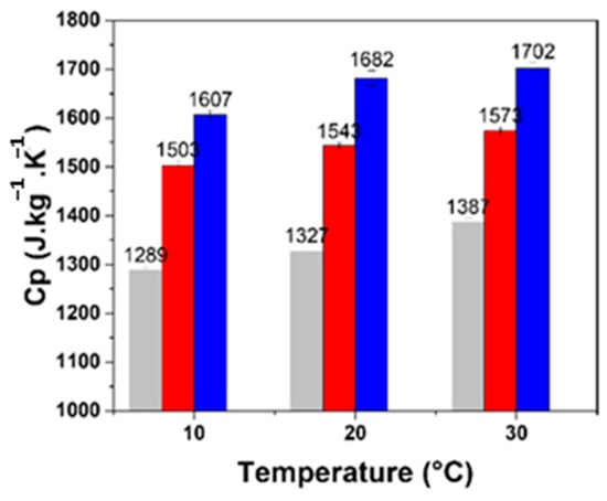 The specific heat capacity values for the formulated panels range from 1327 to 1682 J·kg−1·K−1 at 20 °C, as shown in Figure 7. Notably, at all measured temperatures, the specific heat capacity (Cp) of panels containing only Brewers’ Spent Grains as granular (BSG100) is significantly higher than that of the formulation with hemp shives (BSG0) or the mixed formulation (BSG50), as illustrated in Figure 6. This increase in specific heat capacity is attributed to the unique properties of BSGs, which exhibit low thermal conductivity, alongside a high specific heat capacity.