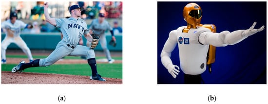 Space robots may be represented as cylindrical center rigid bodies and highly flexible appendages. (a) A U.S. Naval Academy pitcher throws to home plate at a baseball tournament (image credit: Technical Sergeant David W. Carbajal) [,]. (b) NASA’s first humanoid space robot (image credit: NASA) [,].