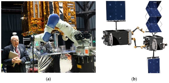 (a) NASA mission to repair and refuel satellites on orbit (image credit: NASA [,]. (b) Satellite servicing mission of the Defense Advanced Research Projects Agency (DARPA). Image credit: DARPA [,].