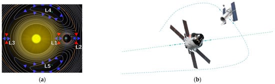 - Image Created by NASA. Available online: https://en.wikipedia.org/wiki/Halo_orbit#/media/File:Lagrange_points2.svg (accessed on 31 December 2023).