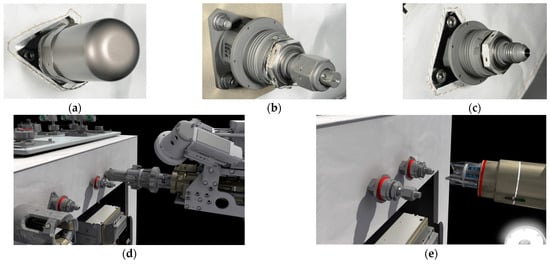 NASA Robotic Refueling Mission (RRM) task: refueling. Individual pieces of hardware show the seals that typical satellite fuel valves have. (a) A tertiary cap with a “lock wire” visible underneath; (b) a safety cap/actuation nut with a securing lock wire; (c) an exposed fuel valve; (d) a safety cap tool removing a safety cap; and (e) a nozzle tool being connected to the now exposed fuel valve, enabling fuel transfer (image credit: NASA [,]).