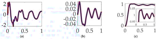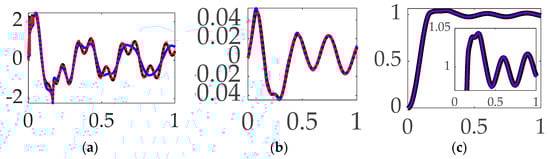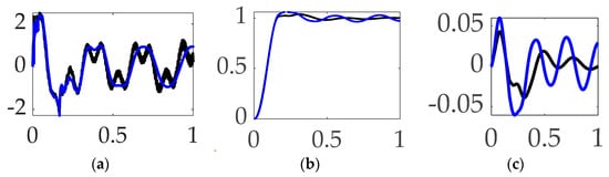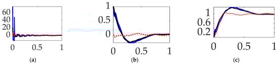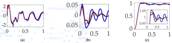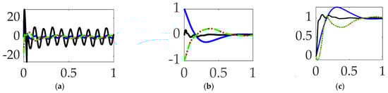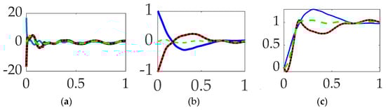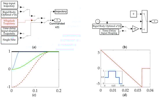 The study in [] establishes the present study’s comparative benchmark offered by classical control methods augmented with signal processing filters, and the prequel’s benchmark space robot is the same U.S. Navy system, with natural frequencies of vibration that are so low as to be excited by even low-bandwidth feedback systems. The utilization of versine shaping proved superior to step commands when the structural filters were designed to achieve system stability margins (classical gain margin and phase margin). The study in [] is an intermediate sequel investigation on the same Navy space robot system, where so-called systems theory methods of Lev Pontryagin were used to develop an open-loop optimal control to minimize maneuver time with quiescent final conditions. The surprising results indicated a “whiplash”-shaped command (initially in a direction opposite to the commanded terminal state) minimized maneuver time. Results were produced in a commercial, pseudospectral optimization software, and then validation was performed analytically using six necessary conditions of optimization: (1) the Hamiltonian minimization condition; (2) adjoint equations; (3) the terminal transversality condition; (4) the Hamiltonian final value condition; (5) the Hamiltonian evolution equation; and (6) Bellman’s principle. Importantly, the biomimicking “whiplash” shaping failed to validate one of the six necessary conditions motivating continuing research (including this present manuscript as a new sequel). The biomimicry whiplash control [] behavior (depicted earlier in this manuscript in Figure 1) is evaluated in this present study applied to shaping the commanded input rather than as a feedforward control.