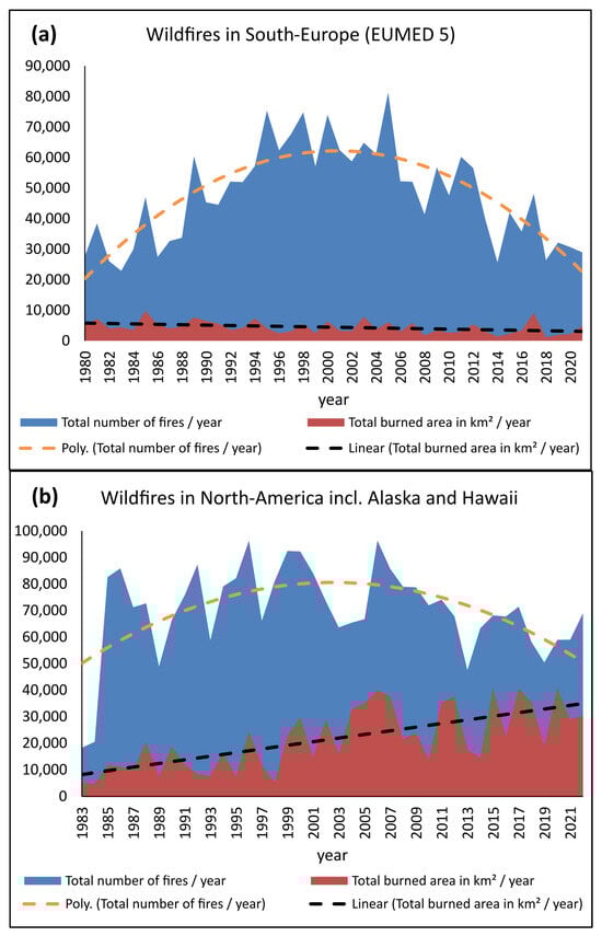 Number of wildfires and burned area (in km2) per year in (a) European Mediterranean countries (EUMED 5 = Portugal, Spain, southern France, Italy, and Greece) and (b) North America including Alaska and Hawaii. Total number of wildfires (blue) with polynomial trend line (orange), total burnt area (red) with linear trend line (black) (data from [,]).