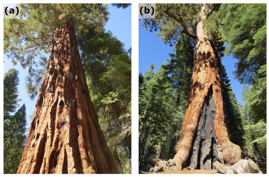 Giant sequoias (Sequoiadendron giganteum) in the Yosemite National Park, CA, USA. (a) The tree bark is undamaged, (b) the tree shows signs of fire damage but is still alive.