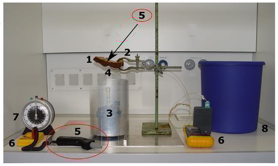 Experimental set-up for fire-tolerance analyses in the fume cupboard. A bark sample (1) is clamped (2) at a height of 43 cm over (3) a Bunsen burner with a flame length of about 20 cm. Additionally, the Bunsen burner can be protected by a hollow aluminum cylinder (indicated as “see-through” in the picture). The flame temperature is measured by (4) a thermocouple, and the temperature of the inner bark surface, i.e., the position of the cambium in the living tree, is measured in a contactless manner by (5) an infrared thermometer (position indicated). Data are recorded via (6) a computer. Time is measured by (7) a stopwatch. As a precaution, (8) a bucket of water should be available to throw in any bark samples that catch fire.