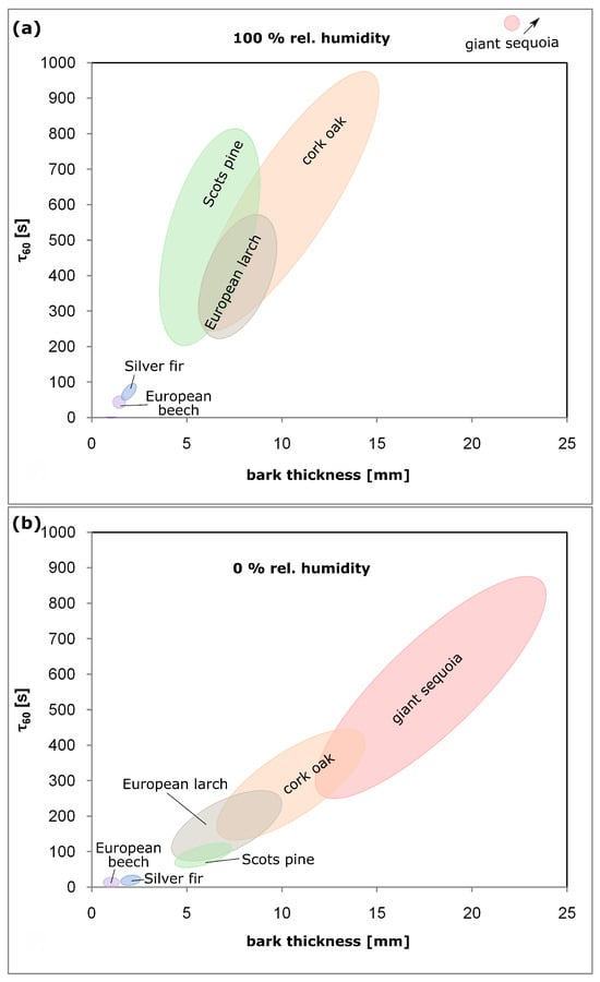 Fire tolerance of various bark samples. The time is given as a function of bark thickness. (a) Samples were stored at 100% relative humidity. The values for the giant sequoia are not shown within the graph because all samples had not reached the temperature of 60 °C after 5 min. This is indicated by the arrow. (b) Samples that were dried and stored at 0% relative humidity.