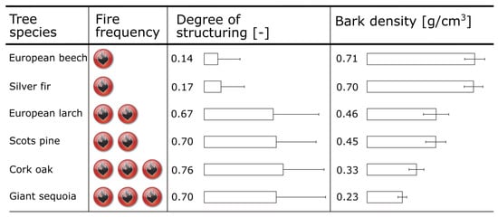 Other bark properties such as density and degree of structuring also show a correlation with fire tolerance, but their importance in determining the extent of fire tolerance appears to be secondary to the influence of bark thickness and bark moisture (Figure 7). Bark density in terms of mass per volume was measured by xylometric methods []. Surface structuring of the bark is depicted in Figure 4. The degree of structuring is calculated from the maximum and minimum bark thicknesses and the thicknesses at two randomly chosen points of the bark sample []. The higher the value, the more pronounced the surface structuring.