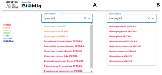 Search bar automatically suggests taxonomic terms associated with a query, covering both (A) scientific names and (B) vernacular names.