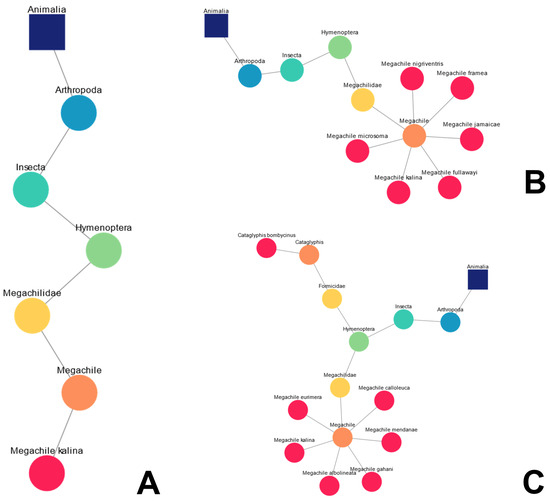 Examples of dynamic taxonomic diagrams following multiple queries associated with bees. (A) Linear diagram created after single search for the bee species Megachile kalina; (B) expansion of the “taxonomic children” of the genus Megachile; (C) subsequent search for the desert ant species Cataglyphis bombycinus.