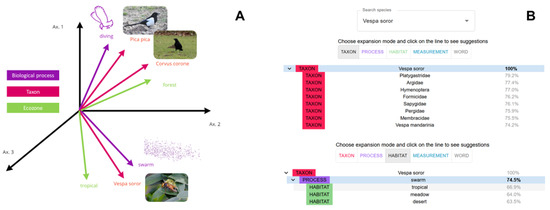Figure 4A presents a more detailed example of how these text embeddings, and the evaluation of their semantic proximity with the scientific corpus, work in practice. Here, seven text entities are represented as vectors in a fictive 3D-space: three taxon names (“Pica pica”, “Corvus corone”, and “Vespa soror”); two biological processes (“diving” and “swarming”); and two habitat characteristics (“forest” and “tropical”).