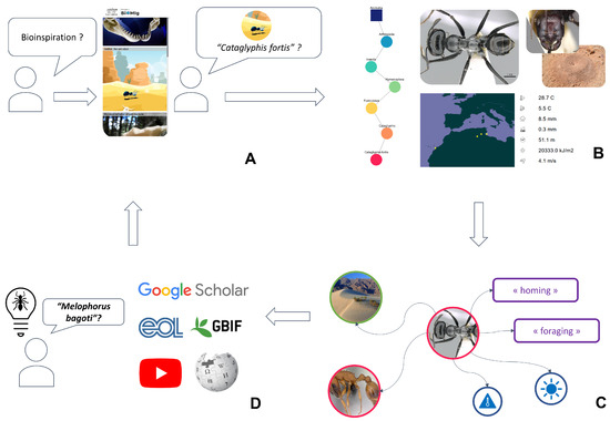 Figure 5 presents how a user might explore the Bioinspire-Explore tool. If they are new to the concept of bioinspiration, they may start by visiting the “Bioinspirations” page (Figure 5A) that presents a handful of existing initiatives in the field of bioinspired design (using images, videos, text, and references). Via this page, they might read about the navigational abilities of the desert ant Cataglyphis fortis. They decide they would like to learn more about this species via the “Biodiversity” page (being redirected automatically via the species name, or by typing its name directly into the search box). Figure 5B shows the information that is provided at this stage (as already described in Figure 2): the species taxonomic position, its appearance, its geographical distribution, and climatic niche.