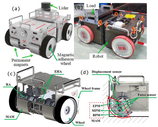 The adhesion mechanism system utilizes permanent magnets to achieve full-scenery climbing ability and redundant load-bearing mobility. The magnetic adhesion wheel comprises various components, such as a wheel frame, wheels, rotary actuators (RAs), electro-hydraulic actuator (EHA), magnetic adhesion module (MAM), force sensor, and displacement sensor. For a better understanding of these components, please refer to Figure 2. The outer layer of the magnetic adhesion wheel is coated with polyurethane, while the inner layer is made of an aluminum alloy hub. The polyurethane coating directly contacts the wall surface to provide the necessary friction. The wheels are powered by 48 VDC and driven by RAs. The MAM comprises three groups of permanent magnets: end permanent magnets (EPMs), middle permanent magnets (MPMs), and bottom permanent magnets (BPMs). All magnetic groups are designed using the Halbach array and are located on the inner side of the wheels. The centers of the three groups of permanent magnets lie on the axis of the wheel, creating an enveloping angle of 135°, which ensures sufficient magnetic adhesion force on both sides of the internal angle of the walls. To ensure the safe movement of the robot, the magnetic force of each permanent magnet is constantly monitored in real time using force sensors.