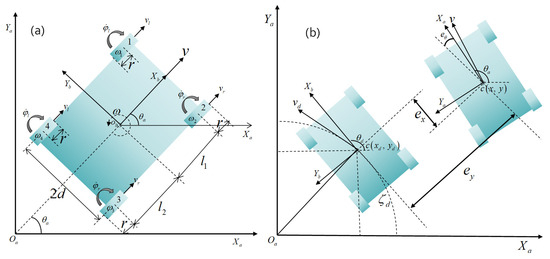 Let , , and be the longitudinal, lateral, and angular velocities in the local coordinate frame, while the relation in the universal coordinate frame in the kinematics model is represented as