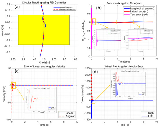 Simulation results of circular trajectory tracking using PID controller; (a) local details of circular trajectory; (b) longitudinal, lateral, and yaw error; (c) linear velocity and angular velocity tracking error; (d) angular velocity errors of right and left wheel pair.
