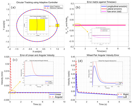 Based on the above configuration, numerical simulation for adaptive kinematic control of the CMo-R is carried out. Compared with the PID controller, the performance of circular tracking is much smoother even in the initial state. There is no oscillation during the tracking period, as shown in Figure 7a,b. The controller produces better performance. Longitudinal and lateral errors are less than 0.5 mm. However, the yaw error is much larger. There exists a constant latency difference between the reference velocity and actual velocity, as shown in Figure 7c, which reduces the tracking performance of angular velocity.