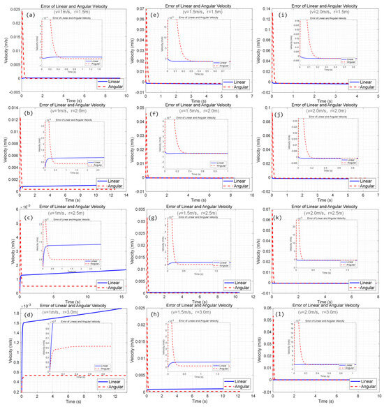 The influence of trajectory curvature and tracking velocity on tracking performance. (a–d) Simulation results with various tracking radiuses when v = 1.0 m/s; (e–h) simulation results with various tracking radiuses when v = 1.5 m/s; (i–l) simulation results with various tracking radiuses when v = 2.0 m/s.