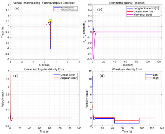Simulation results of linear trajectory tracking with vertical orientation; (a) global view of tracking trajectory; (b) Error of position and orientation; (c) Error of linear and angular velocities; (d) angular velocity errors of right and left wheel pair.