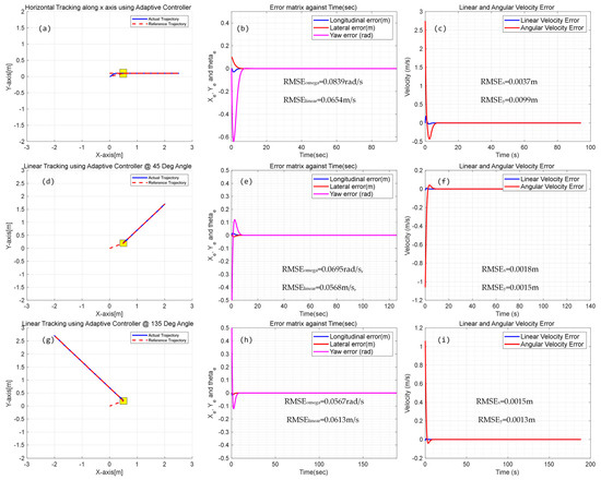 Simulation results of linear trajectory tracking with different orientations; (a–c) Tracking trajectory, position, and orientation error and velocity tracking error of simulation with horizontal orientation; (d–f) Tracking trajectory, position, and orientation error and velocity tracking error of simulation with 45° orientation; (g–i) Tracking trajectory, position, and orientation error and velocity tracking error of simulation with 135° orientation.