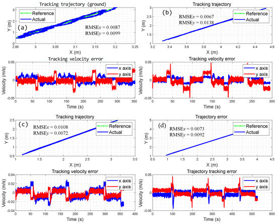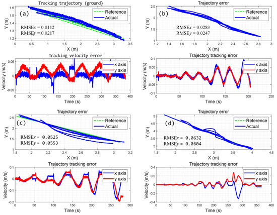By utilizing the proposed adaptive kinematic controller that considers the slip rate, another set of linear trajectory-tracking experiments was conducted, and the results are shown in Figure 12. When performed on an HP, the tracking errors in the x-axis and y-axis directions are 8.7 mm and 9.9 mm, respectively. It has met the accuracy requirements of most operations, especially in the field of climbing manipulation. Then, the proposed adaptive kinematic control method is also verified on 50° IP and 60° IP, as shown in Figure 12b,c, and it exhibits a certain level of effectiveness in suppressing slip, with a minimum error of only 6 mm. Similar results are achieved in the experiments conducted on a VP, as shown in Figure 12d, and the minimum error is only 6.7 mm. Furthermore, the velocity navigation errors in the x-axis and y-axis directions are negligible, with error peaks at only 0.1% of the travel speed. This means that the adaptive skid-steering control approach can be applied to inclined planes without knowing the tilt angle. The proposed method, with its simple framework and relatively stable performance, demonstrates good applicability in the field of wall-climbing manipulation.