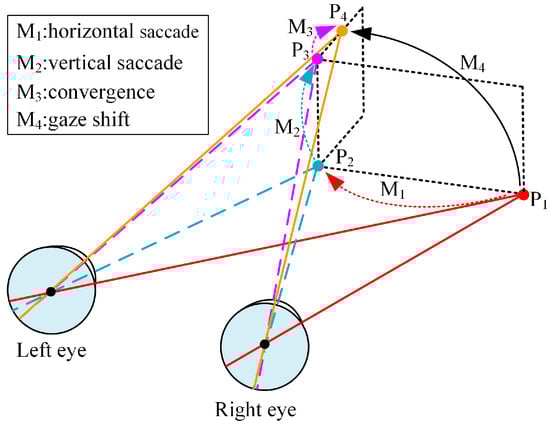 To better understand the movement mechanism of the gaze function, we have created a schematic diagram of the human eye cooperative movement, shown in Figure 2. From a physiological point of view, the human eye changes from the gaze point to the gaze point through the coordination of saccade and convergence. We assume that the eye movement is sequential, and the process is decomposable into , , and . Specifically, the shift from the gaze point to the gaze point is first achieved through the horizontal saccadic movement . The shift from the gaze point to the gaze point is then accomplished through the vertical saccadic movement . In the end, the convergent movement is employed to shift the gaze point to the gaze point .