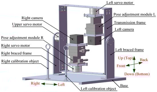 Inspired by the gaze mechanism of human eyes, the mechanical structure of the BBCPD was designed. Its 3D model is shown in Figure 3. The device is composed of two RGB cameras, three servo motors, two pose adjustment modules, two braced frames, two calibration objects, a transmission frame, and a base. RGB cameras capture images, and servo motors act as the power source. Pose adjustment modules are used to accurately adjust the pose of cameras toward different desired locations. This indicates an increased flexibility of the BBCPD. The transmission frame is designed to transmit motion. Calibration objects are used to calibrate the initial position of the BBCPD. Braced frames serve to ensure the suspension of the transmission frame, guaranteeing the normal operation of the upper servo motor. The role of the base is to ensure the stable operation of the BBCPD.