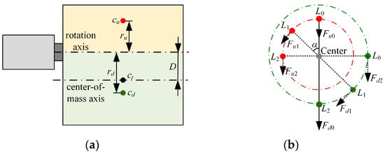 In Figure 4, is the center of mass of the whole load, and represents the vertical distance from to the rotation axis. The rotation axis serves as the boundary, and the load is divided into upper and lower parts. The center of mass of the upper part is denoted as , and the vertical distance from to the rotation axis is defined as . The symbol is the center of mass of the lower part, and the vertical distance from to the rotation axis is expressed as . (i = 0, 1, …) represents the location of the motor, and denotes the rotation angle of the motor at . The mass of the upper part is represented as , represents the mass of the lower part, and g means the acceleration of gravity.