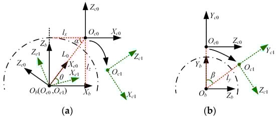 Let represent the transformation from the coordinate frame to the coordinate frame . Based on the transformation relationship between the coordinate frame and the coordinate frame in Figure 6a, Equation (7) can be obtained.