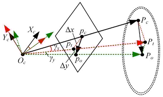 Considering that the optical center coincides with the rotation center, the calibration principle of the angle for the left and upper motors is shown in Figure 7. The projection point of the ring center of the left calibration object in the left camera is when the servo motors are at their zero-position. The projection point of the ring center of the left calibration object in the left camera is when the servo motors are in the initial position of the BBCPS. The projection point of the ring center of the left calibration object in the left camera is when the angle of the upper servo motor is . The horizontal difference between and is represented by , and the vertical difference is . According to the equal vertex angle theorem, the angle of the left servo motor and the angle of the upper servo motor can be calculated using Equation (13).