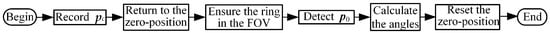 However, Equation (13) will fail when or is greater than a certain angle. When the servo motors are in their zero-position, the ring center may not be detected in the image because the ring center is beyond the field of view (FOV) of the left camera. Considering the above situation, we developed the procedure of the zero-position of the servo motor calibration and adjustment as shown in Figure 8. To prevent multiple circles from being detected, the background of the ring in the image should be kept simple, such as a pure-color wall. First, is determined using the Hough circle detection algorithm [] and recorded as the target point. Next, the left and upper servo motors are returned to their zero-position. To ensure the ring in the FOV, the left servo motor is required to rotate positively n and the upper servo motor needs to rotate positively m. The values of n and m are from 0° to 360°. Subsequently, can be detected using the Hough circle detection algorithm and the angles and can be calculated. The angles at which the left and upper servo motors rotate to the initial position are n + and m + , respectively. Finally, the zero-positions of the left and upper servo motors are reset. The zero-position of the right servo motor can also be reset according to the above procedure.
