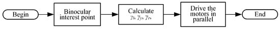 To imitate the movement mechanism of the gaze function, we developed a binocular cooperative motion strategy. The implementation process of the strategy is shown in Figure 9. First, we used Algorithm 1 to extract the binocular interest point. Afterward, the rotation angle of the left servo motor , the rotation angle of the right servo motor , and the rotation angle of the upper servo motor were calculated. The principle of calculating the rotation angles of the three servo motors is shown in Figure 10.