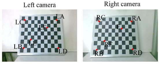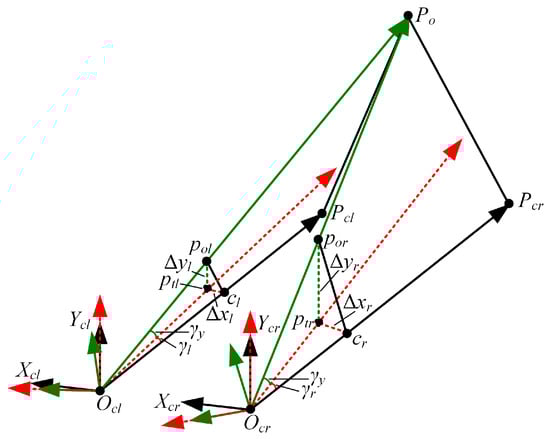 We also take the left camera as an example. Based on the transformation relationship between the coordinate frame and the coordinate frame in Figure 6b, Equation (11) can be obtained.