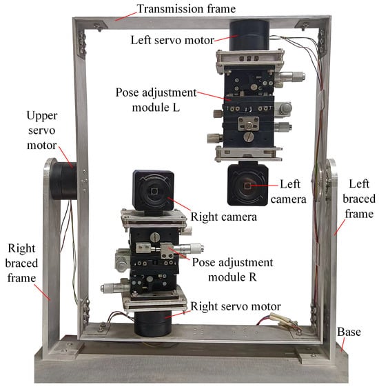 The bottom of the left servo motor is installed at the bottom of the transmission frame, 64 mm to the left side of the transmission frame. Its shaft end is connected to the bottom of the pose adjustment module L, and the top of the pose adjustment module L is linked to the bottom of the left camera. The optical center of the left camera passes through the shaft of the left servo motor. The bottom of the right servo motor is installed at the top of the transmission frame, 64 mm to the right side of the transmission frame. Its shaft end is connected to the bottom of the pose adjustment module R, and the top of the pose adjustment module R is linked to the base of the right camera. The optical center of the right camera passes the shaft of the right servo motor. The shaft end of the upper servo motor is connected to the right side of the transmission frame, 180 mm above the bottom of the transmission frame, and the shaft passes through the optical centers of two cameras. The bottom of the upper servo motor is connected to the top of the braced frame. Braced frames are installed on the left and right sides of the base in opposite poses to make full use of the space. The left and right calibration objects are vertically fixed to the front of the base, located at 125 mm and 245 mm on the left side of the base, respectively. The plane they lie on is parallel to the planes containing the shafts of the three servo motors.
