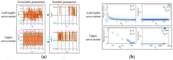By tuning , , and , the motion of the servo motor can better follow the expectation, which is necessary for the control of the BBCPS. The requirement for parameter tuning is that the servo motor can achieve fast and stable motion and keep its motion error at about 0.1%. In response to this requirement, we experimentally determined the optimal , and (the specific tuning process is described in Section 6.2.1).