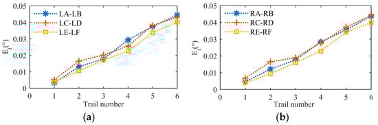 Further observation found that , , , and fluctuated in the six groups of experiments. The reason is that, in different groups, the static error of the servo motor varies, the template-matching error differs, and the influence degree of the initial position calibration error is also different. In each group of experiments, , , , and also exhibited fluctuations. These were because the static errors of the left and right servo motors may differ and the camera pose adjustment errors for the left and right cameras may also vary. We also noted that was the smallest in the second group of experiments, at 2 pixels, while was the largest in the sixth group of experiments, at 4 pixels. Our analysis indicates that the viewpoint change in the images affects . With an increase in the viewpoint change, the rotation angle increases, and the static error of the servo motor also increases. This can lead to a larger difference between the calculated angle and the actual motion angle, potentially resulting in an increase in . Moreover, an increase in the viewpoint change enlarges the error of the initial position calibration, and then the interest point generates a larger motion disparity. This can lead to a larger difference between the calculated angle and the angle needed for the interest point to completely coincide with the principal point, potentially further increasing .