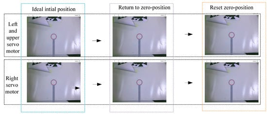 Next, the calibration and adjustment method for the servo motor zero-position was verified. According to the calibration principle of Section 4.2, the process of the calibration and adjustment for the three servo motors is shown in Figure 17. First, the pixel coordinates of the ring center were determined through Hough circle detection, when the BBCPD was in the ideal initial position. The three servo motors returned to their zero-positions. We detected the pixel coordinates of the ring center . According to Equation (13), the calibrated angles for the left, upper, and right servo motors were determined as 26.2°, 8.5°, and 19.6°, respectively. Based on the calibrated angles, the zero-positions of the three servo motors were reset.