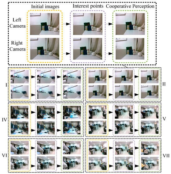 In this part of our work, we conducted six groups of experiments to verify our binocular cooperative perception method. The experimental process is shown in Figure 19. Taking the second group of experiments as an example, the left and right cameras took images at the initial position. Next, the pixel coordinates of the interest points in the left and right cameras were extracted using the binocular interest-point extraction method outlined in Section 5.2. In this process, the size of a template image was set to 30 pixels × 30 pixels. Finally, the motion angles of the three servo motors were calculated using Equation (16), and then the three servo motors were driven in parallel to set the gaze on the interest point. To avoid randomness, we conducted another five groups of experiments following the same steps.