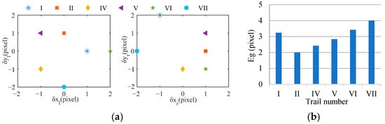 Figure 20a illustrates the distribution of the gaze error. The symbols and are the difference between and , and the meanings of and are the same as those of and . Figure 20b shows the of each experiment. We found that the absolute values of , , , and in each group of experiments were less than 2 pixels, and the average was less than 3 pixels. This indicates that the perceived interest point basically coincides with the principal point, and it confirms the effectiveness of our control method. The error is attributed to the static error of the servo motor, the template-matching error, and the initial position calibration error. The static error of the servo motor can lead the actual motion angles of the servo motors to deviate from the calculated , , and . The template-matching error results in the matched interest point in the right image deviating from the true corresponding interest point. This means that the calculated is not the angle needed in order for the interest point completely coincide with the principal point. The initial position calibration error introduces the interference of the depth information of the interest point. The difference motion disparity results in a difference between the calculated angle and the angle needed for the interest point to completely coincide with the principal point.