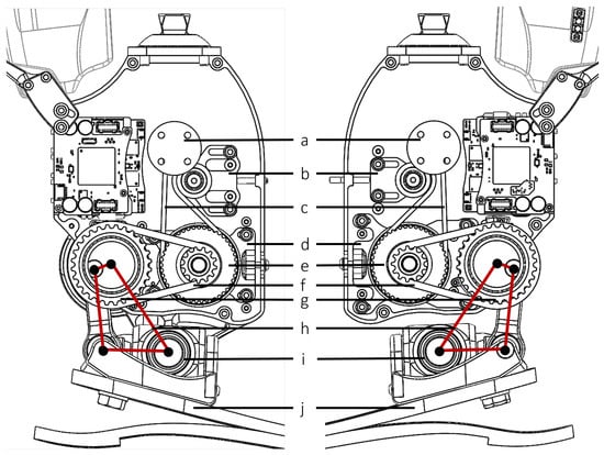 Key components in the transmission: (a) first-stage input pulley (12 teeth) with mounting holes for the motor; (b) belt tensioner for the first-stage belt; (c) first-stage belt (3 mm pitch, 73 teeth); (d) belt tensioner for the second-stage belt; (e) first-stage to second-stage compound pulley (44 and 13 teeth); (f) second-stage belt (5 mm pitch, 40 teeth); (g) second-stage output pulley (28 teeth), coupled with the four-bar linkage; (h) virtual four-bar linkage that drives the foot; (i) 2-DoF joint; (j) foot prosthesis (LP Vari-Flex foot, Össur, Frechen, Germany).