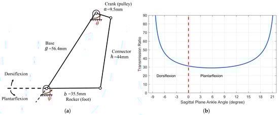 The ankle prosthesis features a transmission system that includes a four-bar linkage. This specific design choice introduces a variable transmission ratio. (a) The four-bar linkage in the transmission. (b) Overall transmission ratio versus sagittal plane ankle angle.