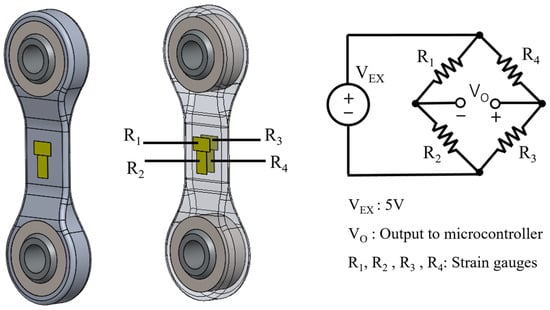 Full-bridge strain gauges (MMF307425, Micro-Measurements, Raleigh, NC, USA) were installed to the “tendon” parts, the connectors in the four-bar linkage of the ankle prosthesis, to measure force. The tendons were machined in 7075-T6 Aluminum. Each side of the tendon has a half-bridge configuration. This setup is depicted in Figure 4. This full-bridge configuration was selected because it can measure axial strain and has much better sensitivity than half-bridge and quarter-bridge configurations. In addition, this full-bridge configuration compensates for the Poisson effect and minimizes the effects of temperature. The joint torques are then derived using these force measurements in conjunction with the moment arms.
