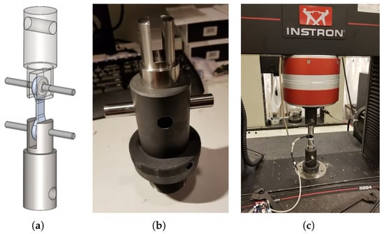 Setup for sensor calibration. (a) Custom fixtures were machined in 304 stainless steel. (b) Fitting the fixture in the universal test machine. (c) Test setup.
